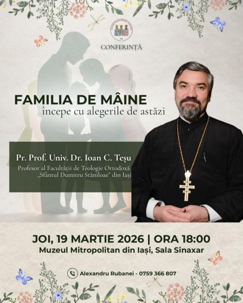 Asociația Prietenii Sfinților Trei Ierarhi organizează conferința „Familia de mâine începe cu alegerile de astăzi”, care va avea loc la ora 18.00, la Muzeul Mitropolitan din Iași – Sala Sinaxar. Invitat special este părintele prof. univ. dr. Ioan C. Teșu, cadru didactic la Facultatea de Teologie Ortodoxă „Sfântul Dumitru Stăniloae” din Iași. Evenimentul se adresează tinerilor, familiilor tinere, studenților și tuturor persoanelor interesate de formarea unei familii sănătoase și de dezvoltarea spirituală în cadrul acesteia.