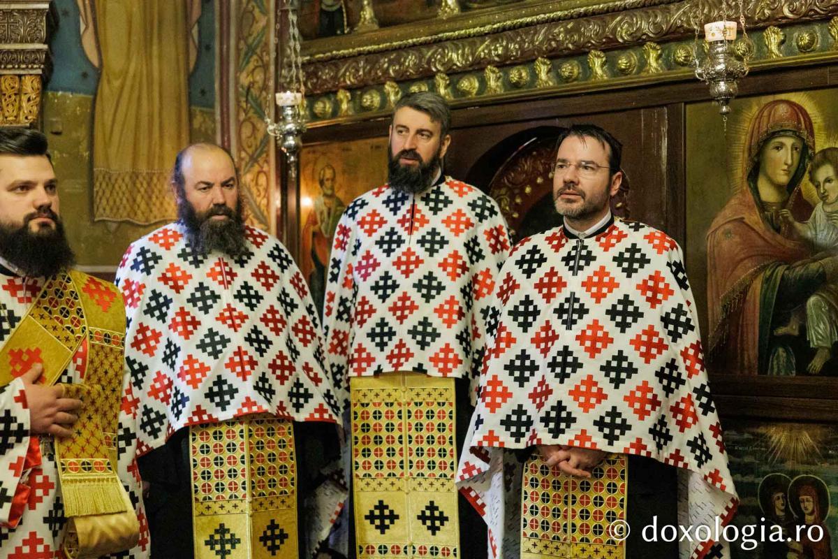 La slujba privegherii a slujit un sobor de preoți și diaconi sub protia părintelui arhimandrit Elisei Nedescu, starețul Mănăstirii „Sfinții Trei Ierarhi” din Iași, iar răspunsurile liturgice au fost date de Corul preoțesc „Apostolii” (în strana dreaptă) și, respectiv, de corul mănăstirii Copou (în strana stângă).